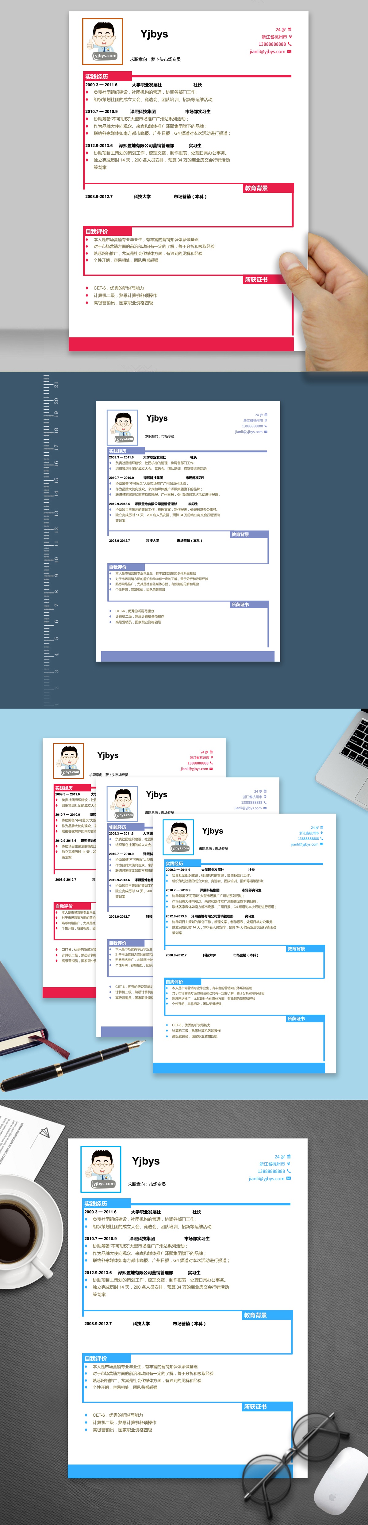 A184常用简历模板亮蓝,红,蓝