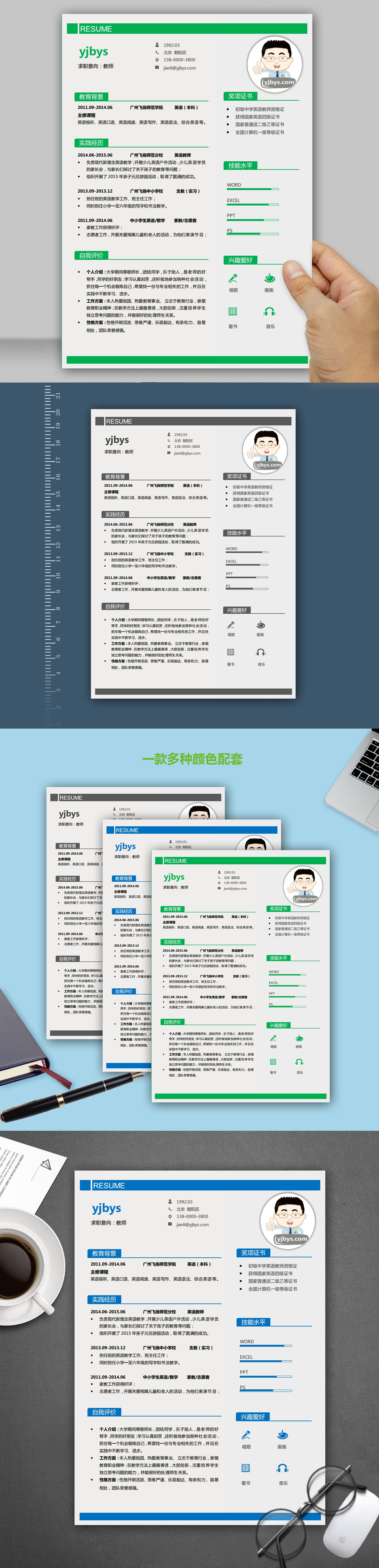 A423简约简历模板蓝,灰,绿