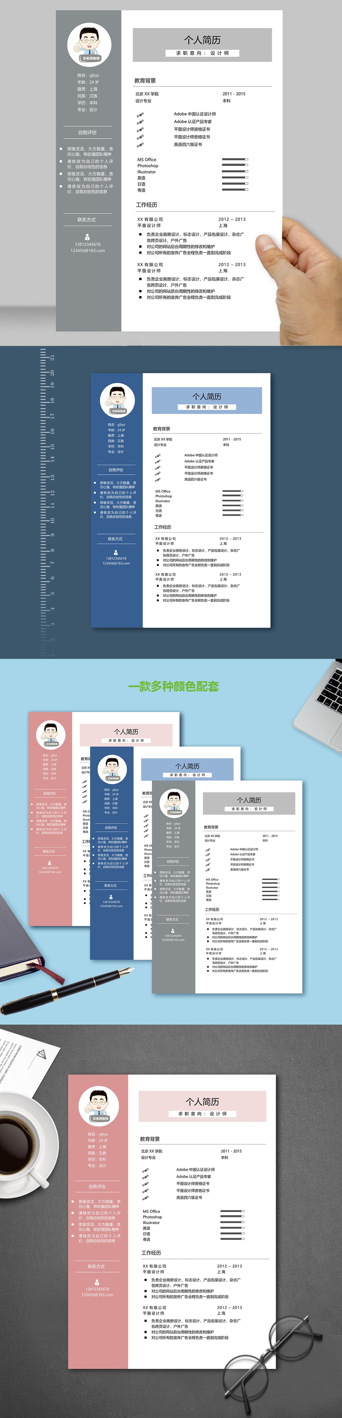A606简约简历模板灰色,蓝色,粉色
