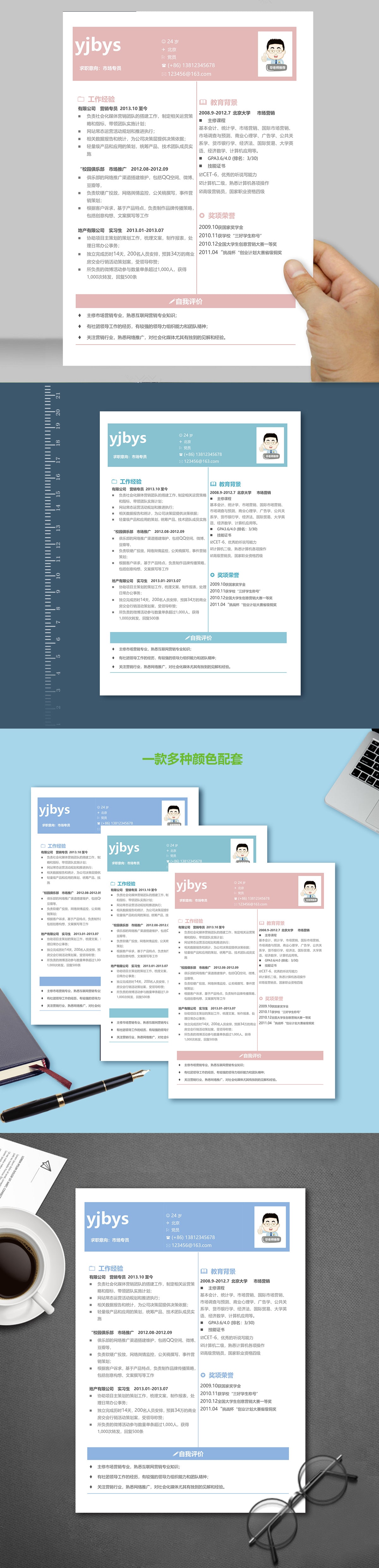 A621简约简历模板粉红,青蓝,浅蓝
