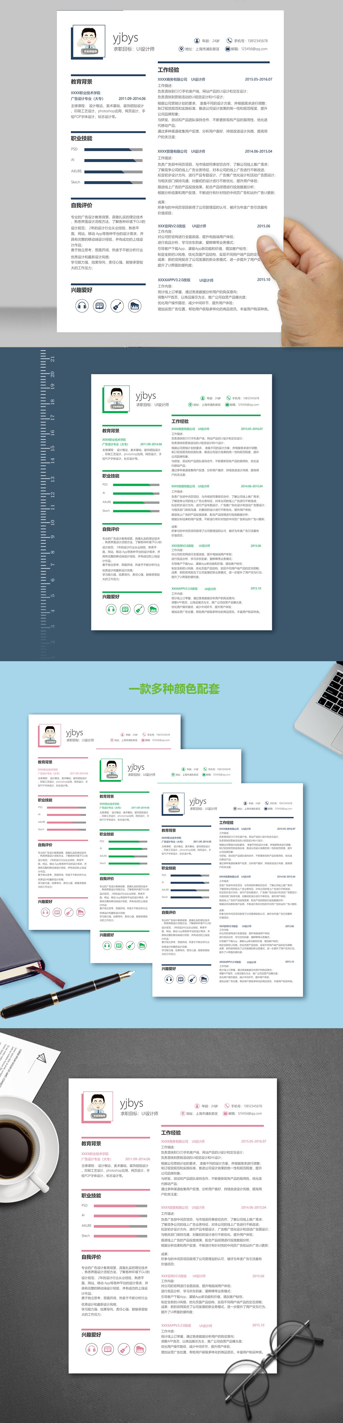 A636简约简历模板蓝色,粉色,绿色